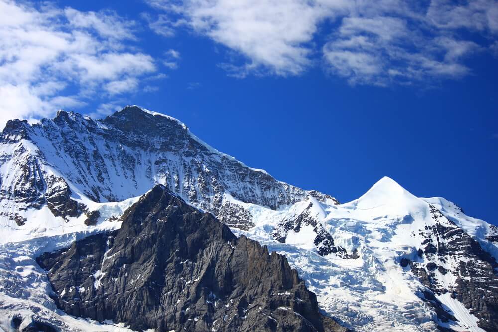 The famous trio in the Bernese Alps includes Eiger, Mönch and Jungfrau, often highlighted among the mountains in Switzerland. These three peaks dominate the skyline above Interlaken and the Lauterbrunnen Valley. Together they create one of the most iconic alpine panoramas in the country. Visitors can access the region via scenic railway journeys and enjoy glacier views, hiking trails and winter sports.