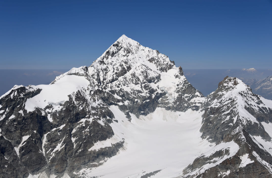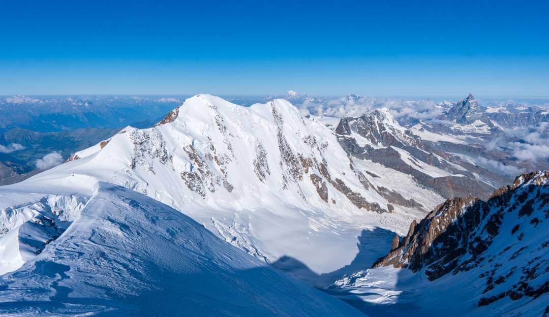 The highest peak among the mountains in Switzerland is Dufourspitze in the Monte Rosa massif. It reaches 4,634 metres and is a favourite for experienced mountaineers. Located near Zermatt, Monte Rosa offers dramatic glaciers and less crowded alpine routes compared to the Matterhorn, providing a more remote high-altitude experience.