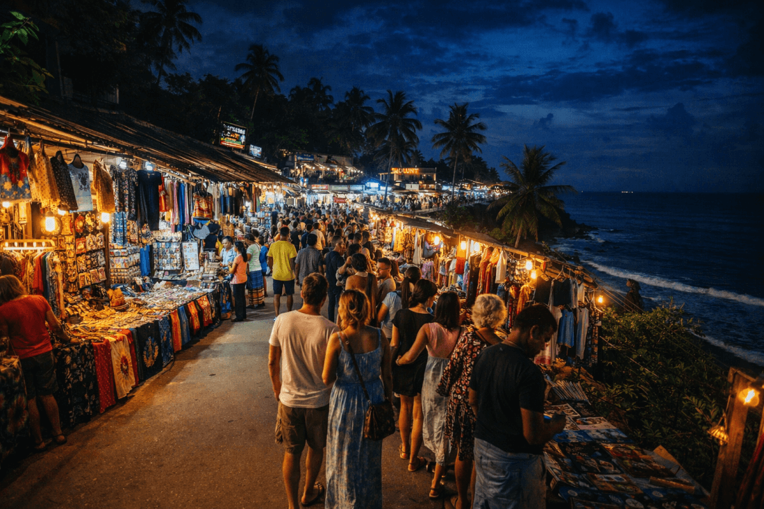 While not a formal night market, the handicraft & street stalls around Varkala Cliff form a lively shopping scene within Varkala nightlife. As cafes and lounges light up after sunset, these stalls offer local handicrafts, boho outfits, accessor...