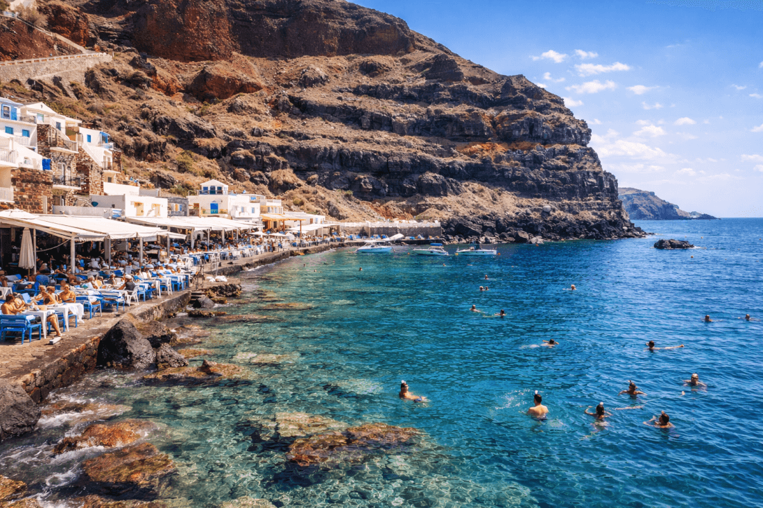Santorini’s beaches are unique due to the island’s volcanic history and are among the most distinctive natural attractions in Santorini. Instead of golden sand, you will find black, red or dark pebbled shores. Beaches such as Perissa and Kamari are known for their black sand, while Red Beach stands out for its striking red cliffs. The scenery is dramatic and different from typical Mediterranean beaches, which makes the experience even more memorable.