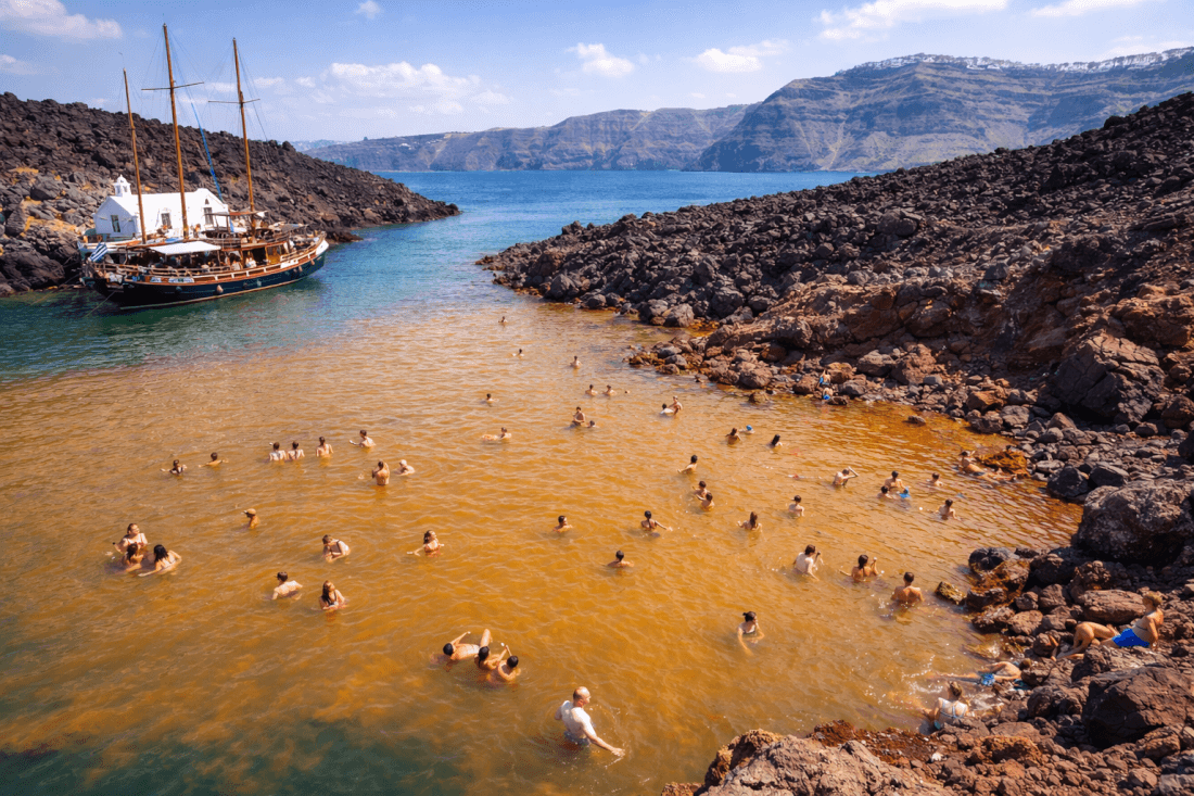 A visit to Santorini’s volcano and hot springs gives you a closer look at the island’s volcanic o...