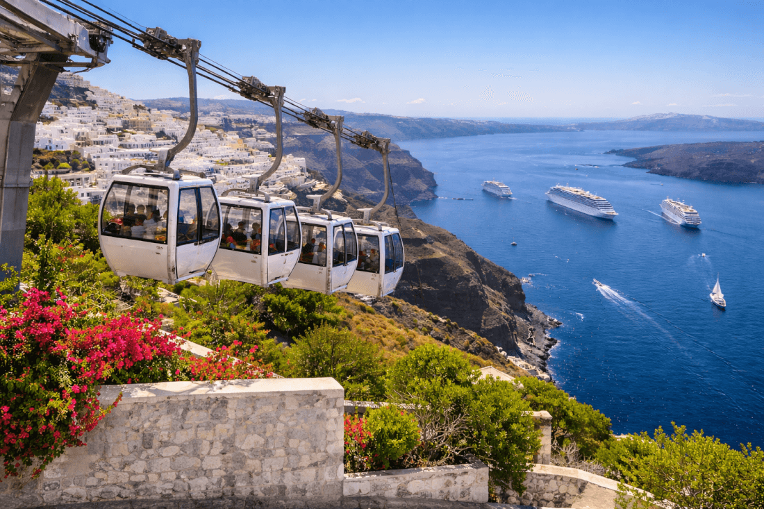 The Santorini Cable Car links Fira with the Old Port below, offering a quick and scenic ride down...